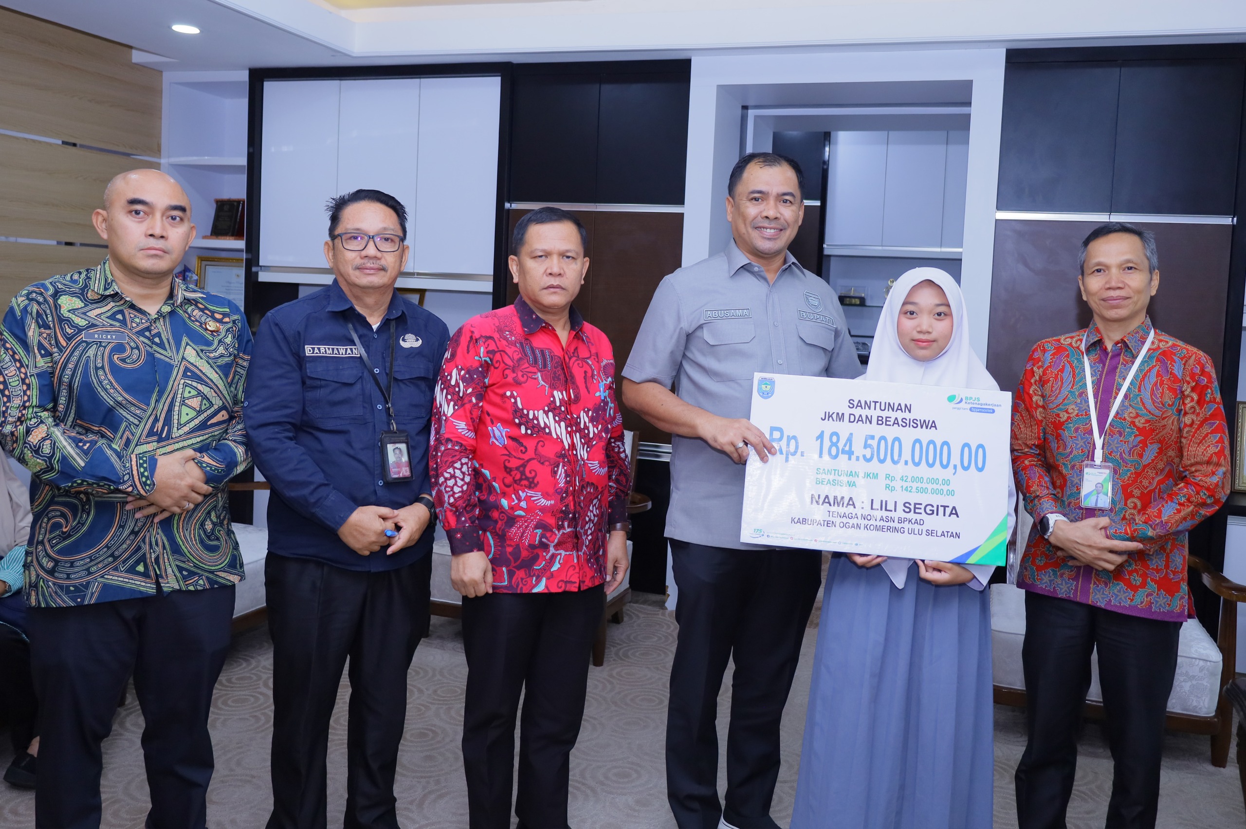 OKU Selatan,Preventif.co.id Bupati Kabupaten Ogan Komering Ulu (OKU) Selatan menyalurkan santunan Jaminan Kematian (JKM) dan beasiswa pendidikan kepada ahli waris almarhumah Lili Segita, yang merupakan pegawai Non ASN di Badan Pengelolaan Keuangan dan Aset Daerah (BPKAD) OKU Selatan.