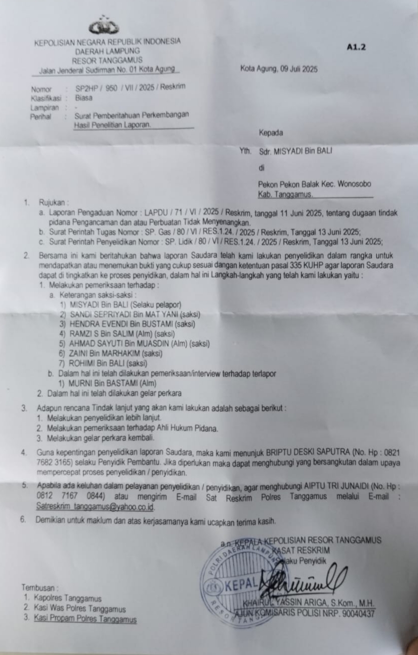 “Surat yang bernomor SP2HP/950/VII/2025/Reskrim. Tersebut memuat tentang pemberitahuan kepada pelapor bahwa untuk meningkatkan status penyelidikan ke penyidikan maka penyidik telah melakukan rangkaian pemeriksaan diantaranya, melakukan pemeriksaan terhadap saksi-saksi, telah melakukan pemeriksaan/interview terhadap terlapor yaitu MURNI BIN BASTARI Alm. Dan pula sudah dilakukan gelar perkara.”terang Misyadi mengutip isi surat.