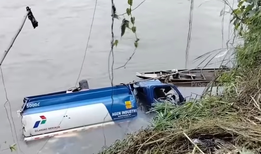 Pada saat melintas di lokasi kejadian, truk tangki BBM berpapasan dengan kendaraan lain, diduga hilang kendali hingga oleng banting setir ke kiri dan terperosok ke aliran sungai kiri jalan.