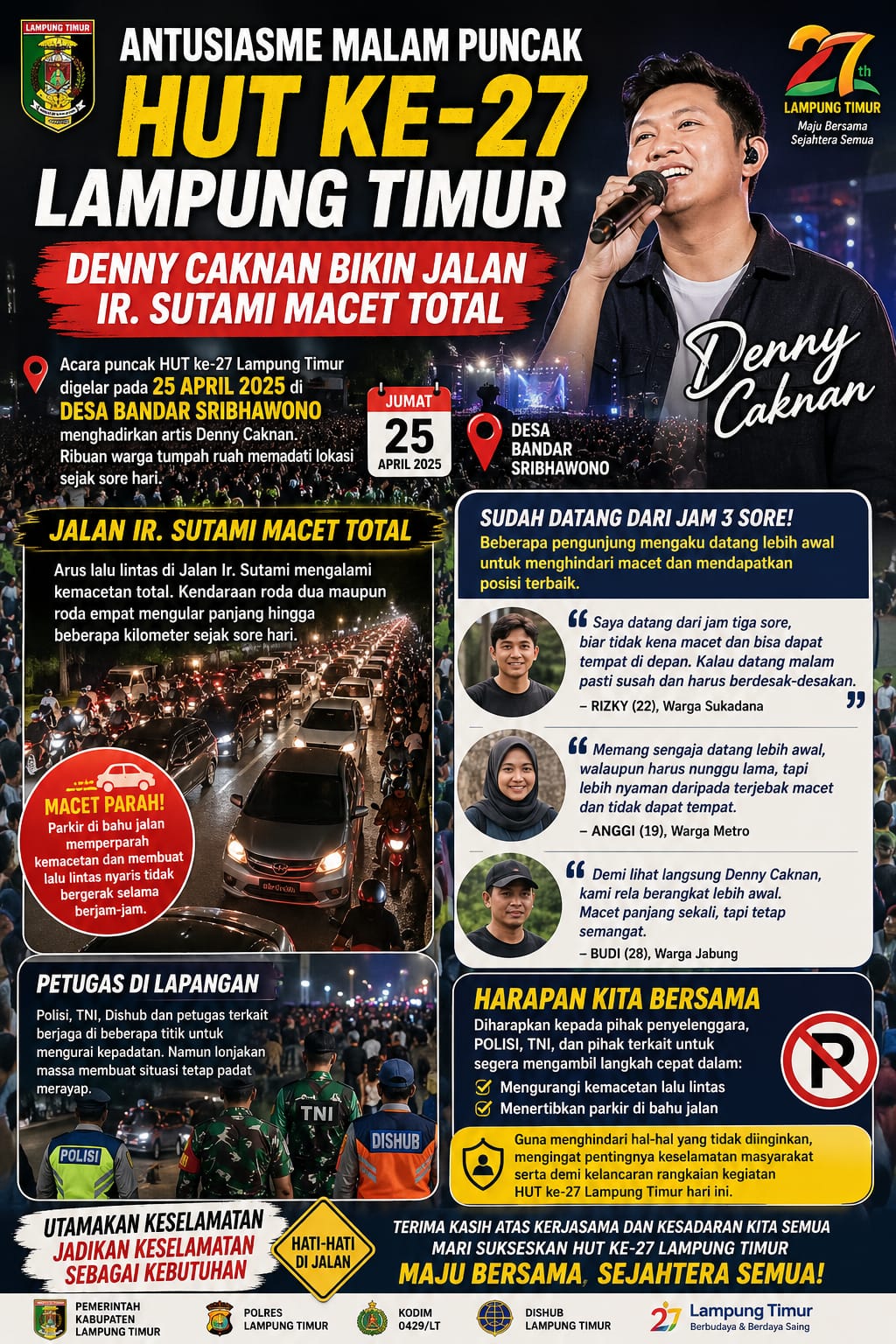 Acara puncak HUT Lampung Timur tersebut digelar pada 25 April di Desa Bandar Sribhawono, yang dipadati ribuan warga dari berbagai daerah sejak sore hari. Kehadiran Denny Caknan menjadi daya tarik utama yang membuat masyarakat berbondong-bondong datang ke lokasi acara.