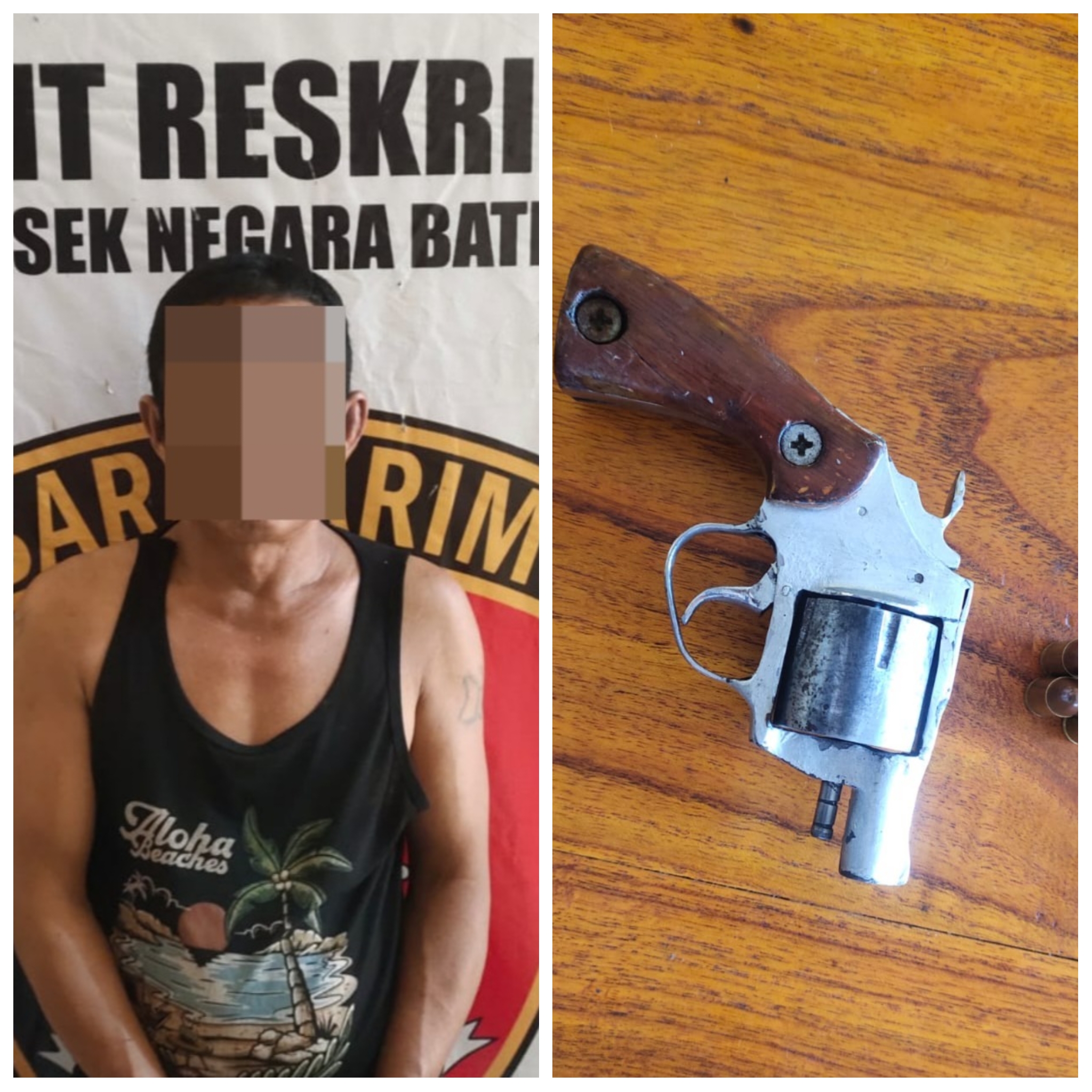 Setelah diamankan oleh petugas, tanpa disertai perlawanan karena diduga melakukan pencurian TBS lalu pada saat dilakukan pemeriksaan badan, didapati barang bukti senpi rakitan dan empat butir amunisi aktif yang disimpan di saku celana sebelah kiri terlapor.