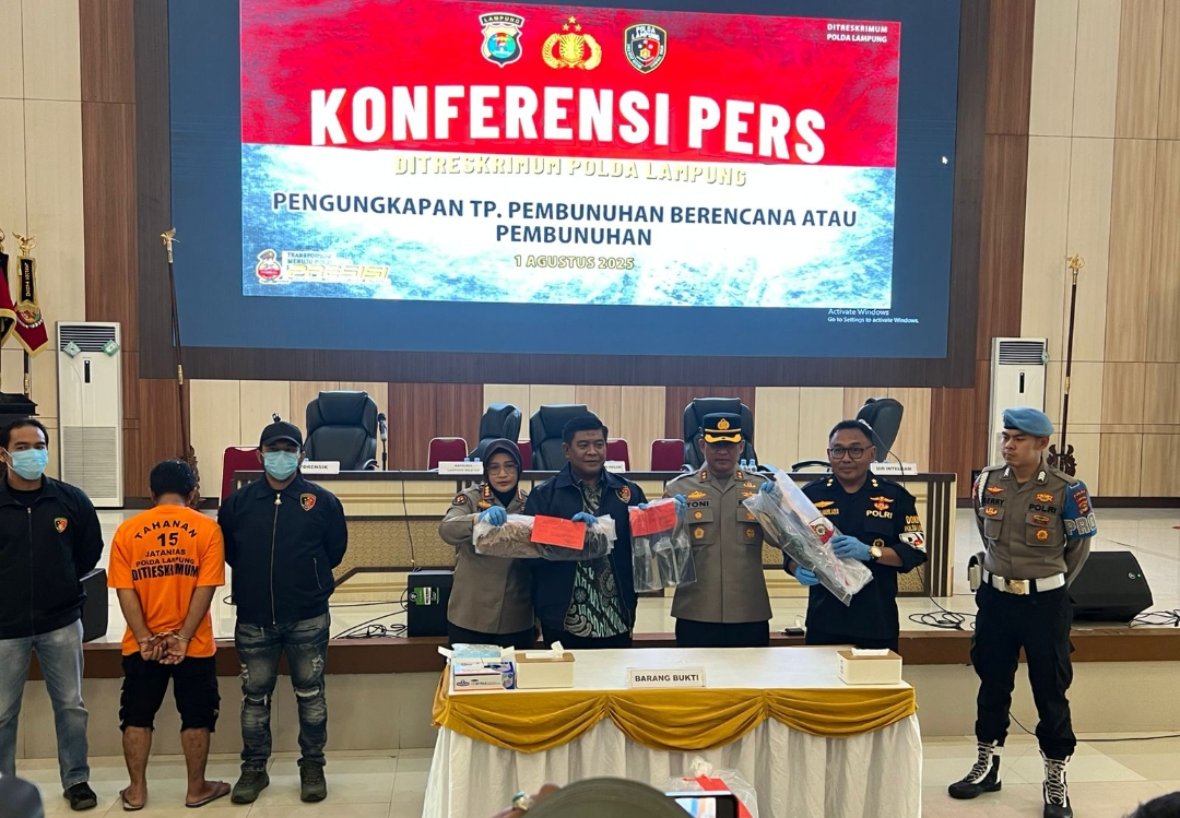 Lampung Selatan,Preventif.co.id Polda Lampung berhasil mengungkap kasus pembunuhan berencana terhadap seorang pegawai koperasi yang jasadnya ditemukan di aliran sungai kawasan Natar, Lampung Selatan. Kapolres Lampung Selatan AKBP Toni Kasmiri turut mendampingi Dirreskrimum Polda Lampung Kombes Pol Indra Hermawan saat konferensi pers pengungkapan kasus, Jumat (1/8/2025) di Gedung Serba Guna Polda Lampung.