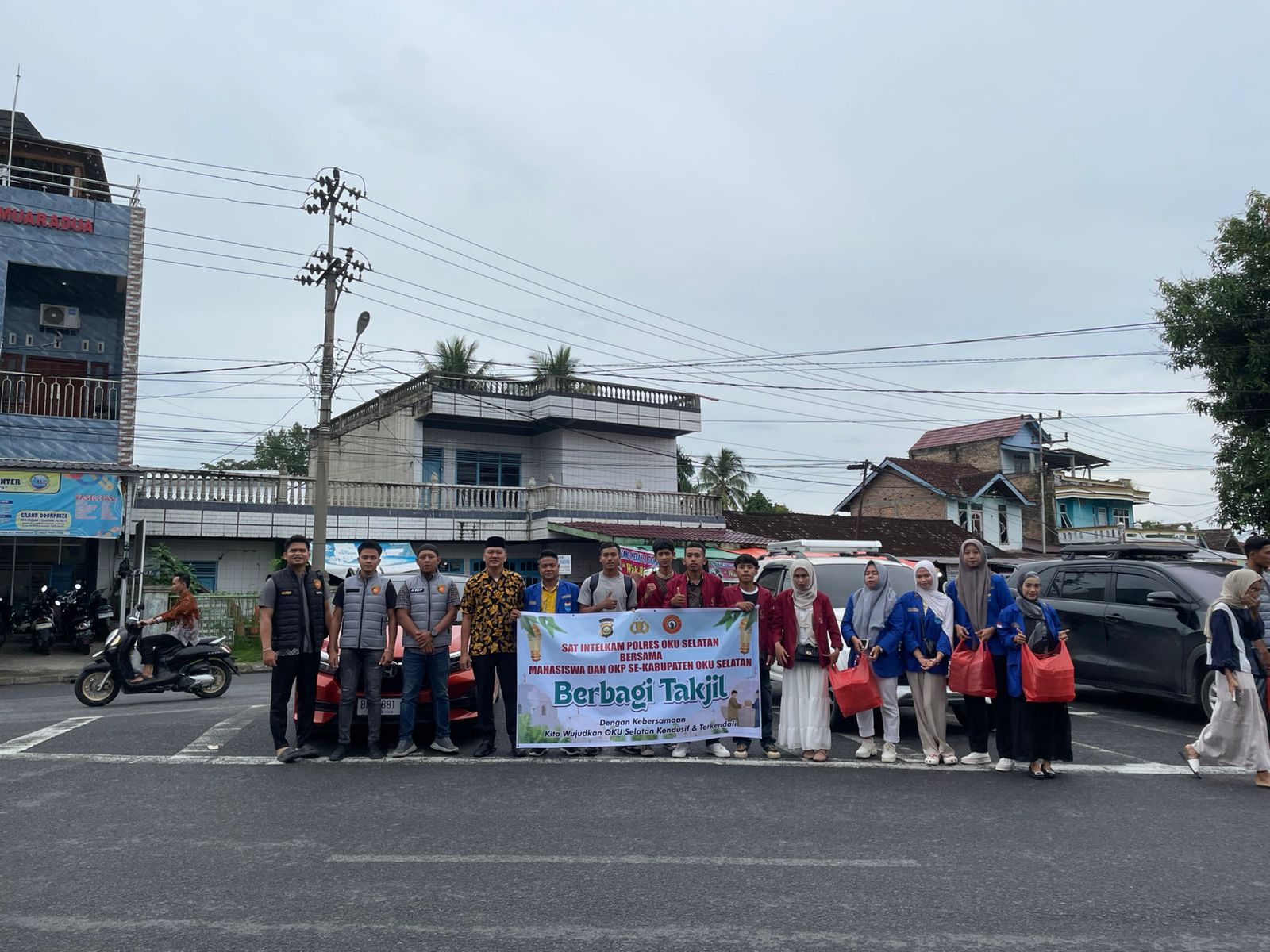 OKU Selatan,Preventif.co.id – Satuan Intelkam Polres OKU Selatan bersama Pergerakan Mahasiswa Islam Indonesia (PMII) OKU Selatan dan mahasiswa Badan Eksekutif Mahasiswa (BEM) Sekolah Tinggi Ilmu Tarbiyah (STIT) Darul Huda OKU Selatan membagikan kurang lebih 150 kotak takjil kepada para pengguna jalan di Simpang Tiga Bumi Agung, Kecamatan Muaradua, Jumat (06/03/2026).