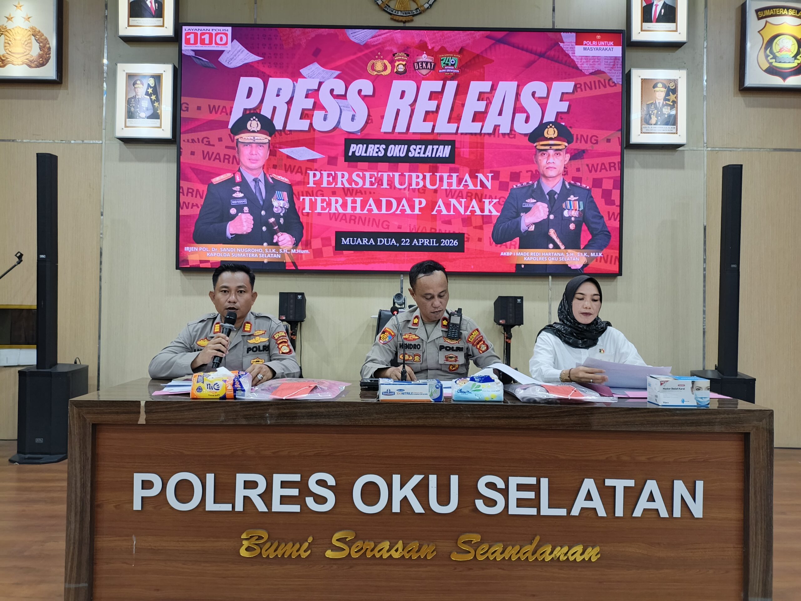 Hal ini sebagaimana yang disampaikan oleh Kapolres OKU Selatan AKBP I Made Redi Hartana, SH., S.IK., M.IK melalui Waka Polres Kompol Hendro Swarno, SH, didampingi Kanit PPA Ipda Devi Sulastri, SH.,MH, Kasi Humas AKP Amir Hamzah, S. Sos., MM, saat Pres Realles, Rabu 22 April 2026.